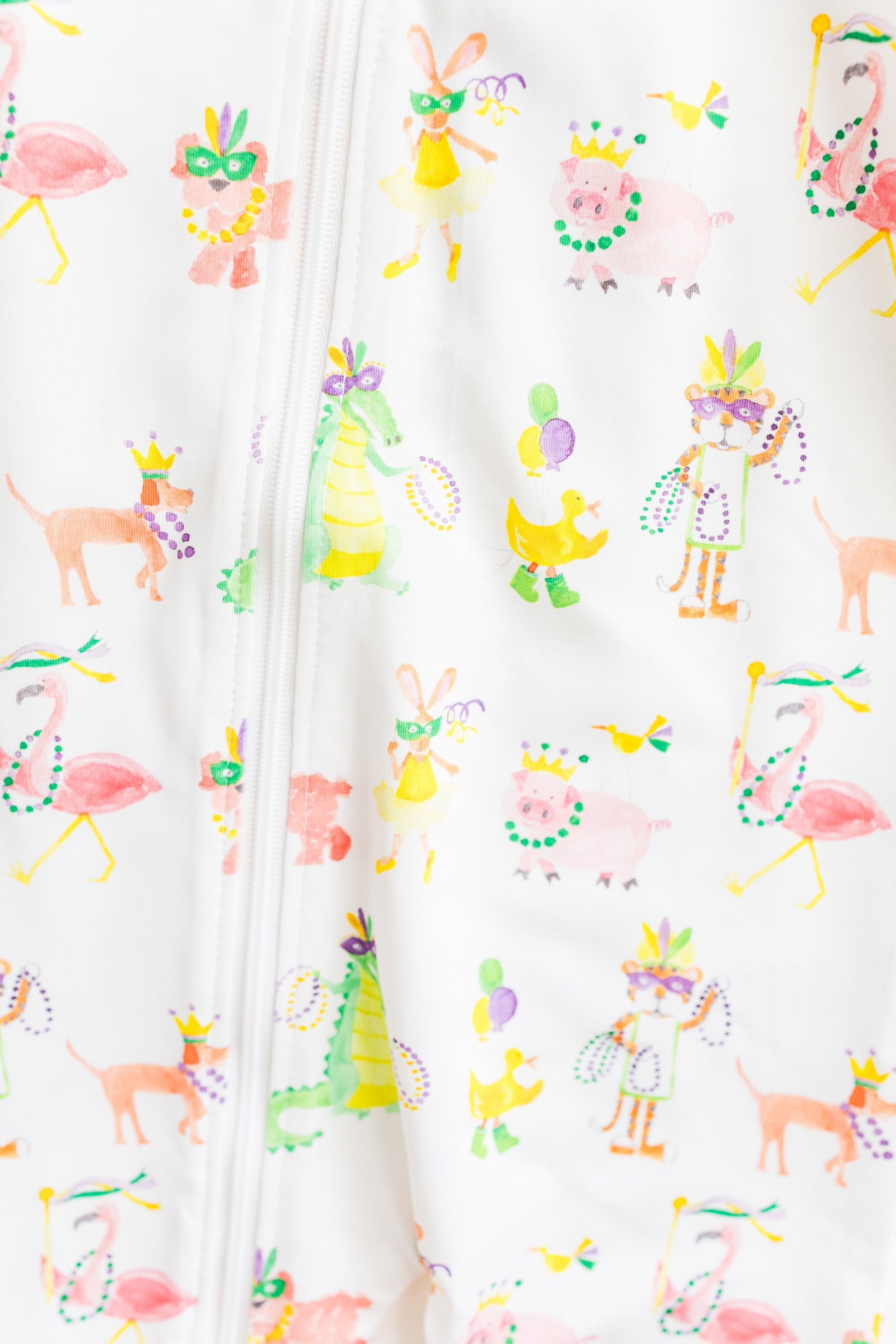 Mardi Gras Animal Parade Zip Pajama, gender neutral