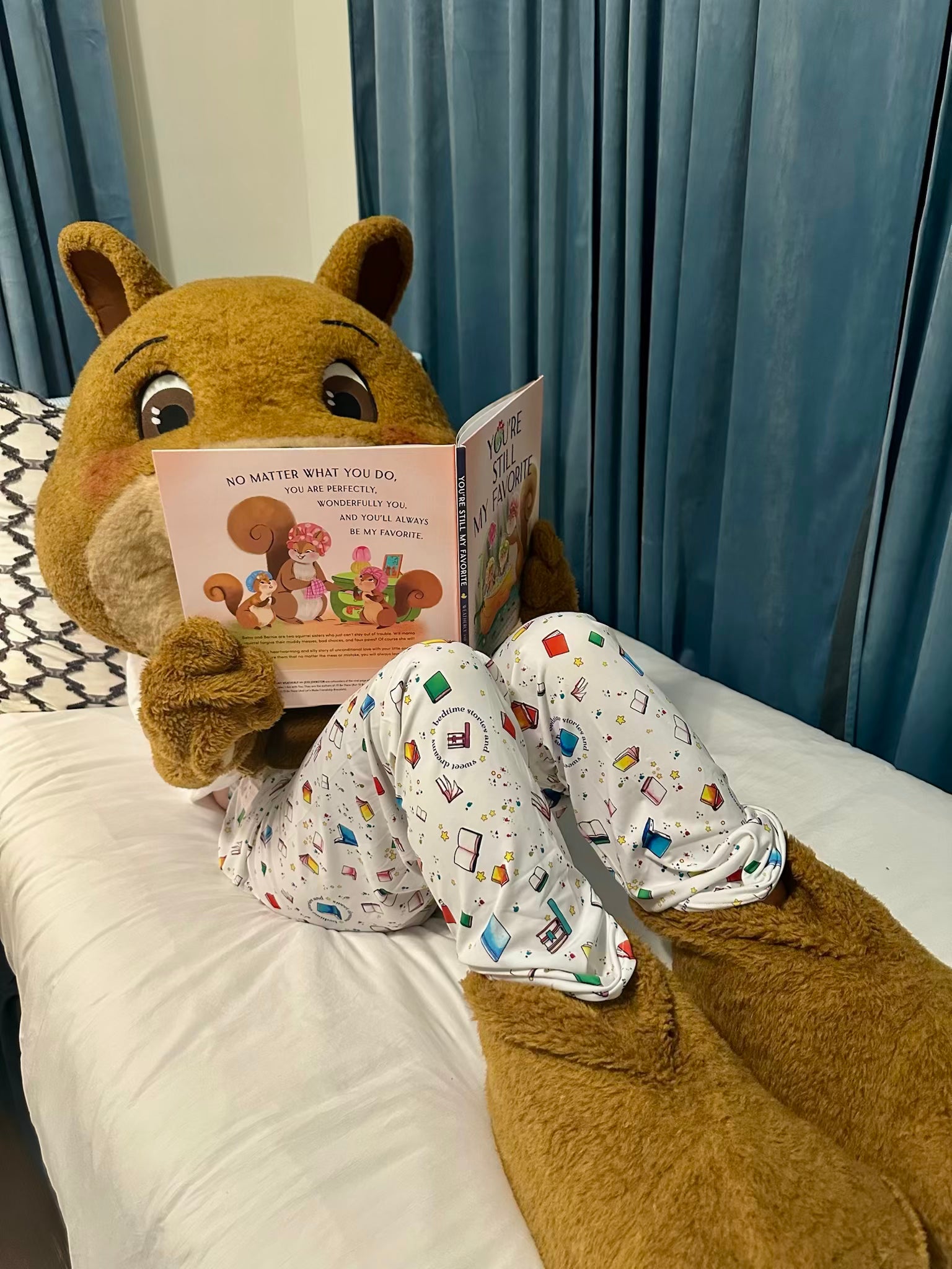 Our new sleepwear collection is inspired by a love of literacy and SHORT the Squirrel's mission: turn waiting time into reading time. Every piece celebrates the joy of books while supporting SHORT's work in schools and community spaces. From interactive literacy kits to school visits and community events with our six-foot mascot, your purchase helps us share the gift of reading with children everywhere.