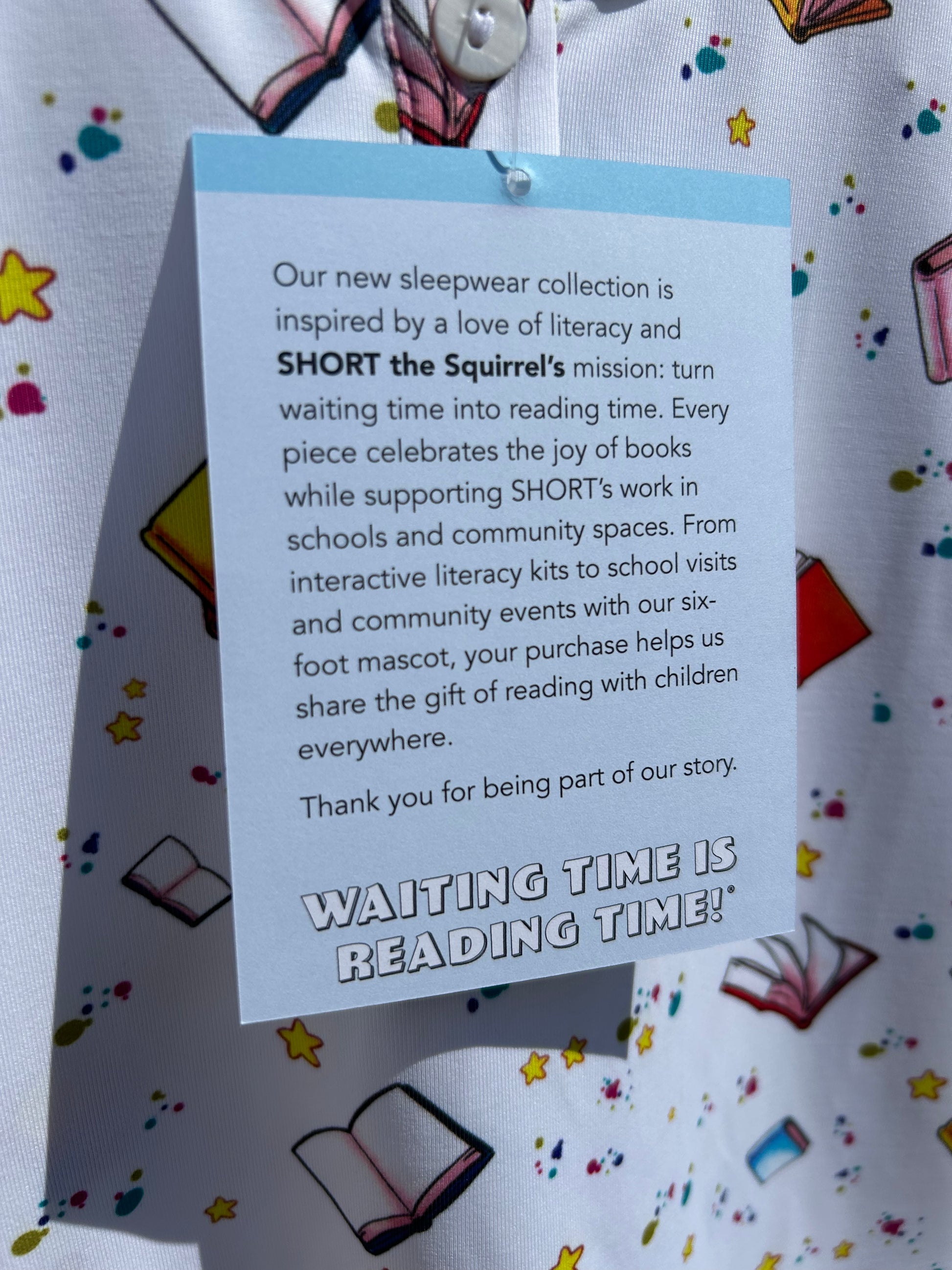 Our new sleepwear collection is inspired by a love of literacy and SHORT the Squirrel's mission: turn waiting time into reading time. Every piece celebrates the joy of books while supporting SHORT's work in schools and community spaces. From interactive literacy kits to school visits and community events with our six-foot mascot, your purchase helps us share the gift of reading with children everywhere.